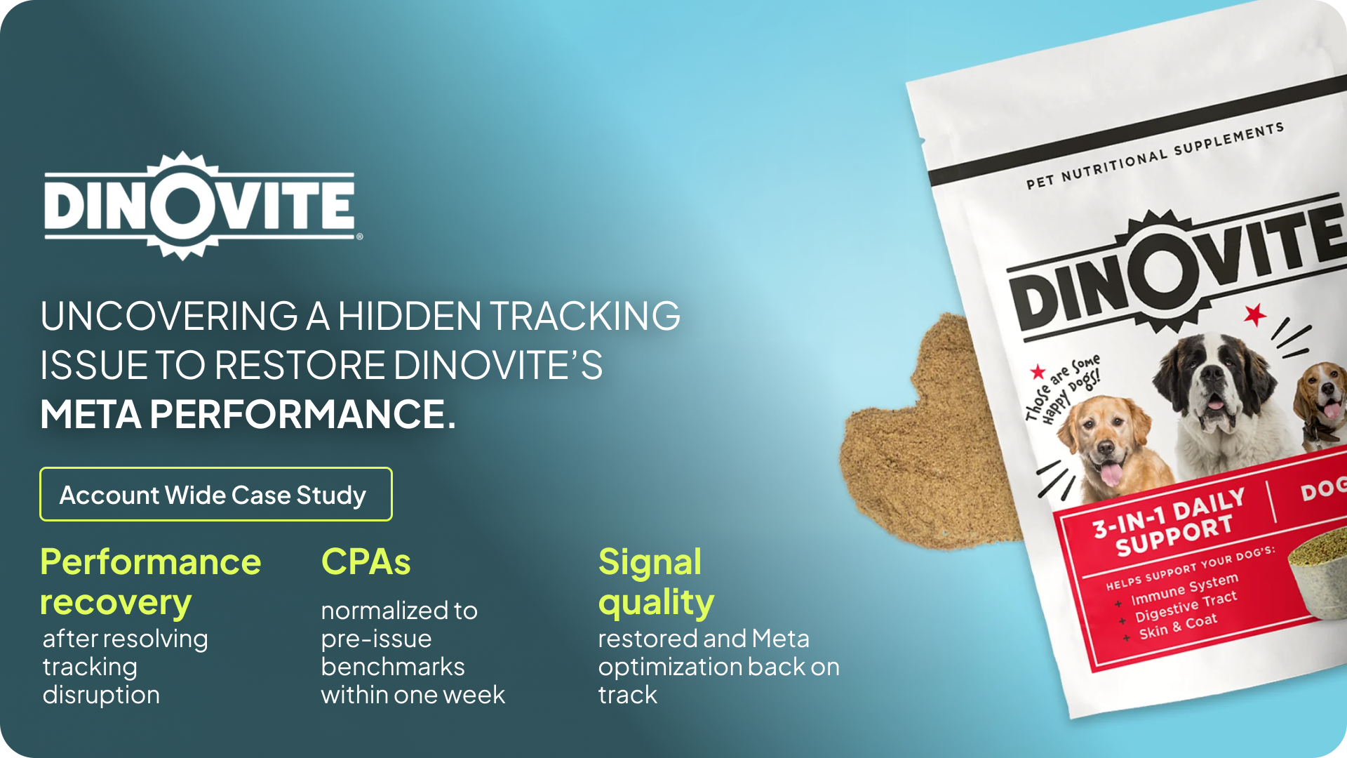 Dinovite is a pet supplement brand specializing in daily nutrition for dogs and cats. In mid-July, the Structured team noticed an unexpected and unusual spike in cost per acquisition (CPA) across Dinovite’s paid media accounts (most notably on Meta), despite no visible campaign or targeting issues within the platform. This sudden inefficiency risked derailing performance momentum during a key seasonal window, prompting an immediate diagnostic review.